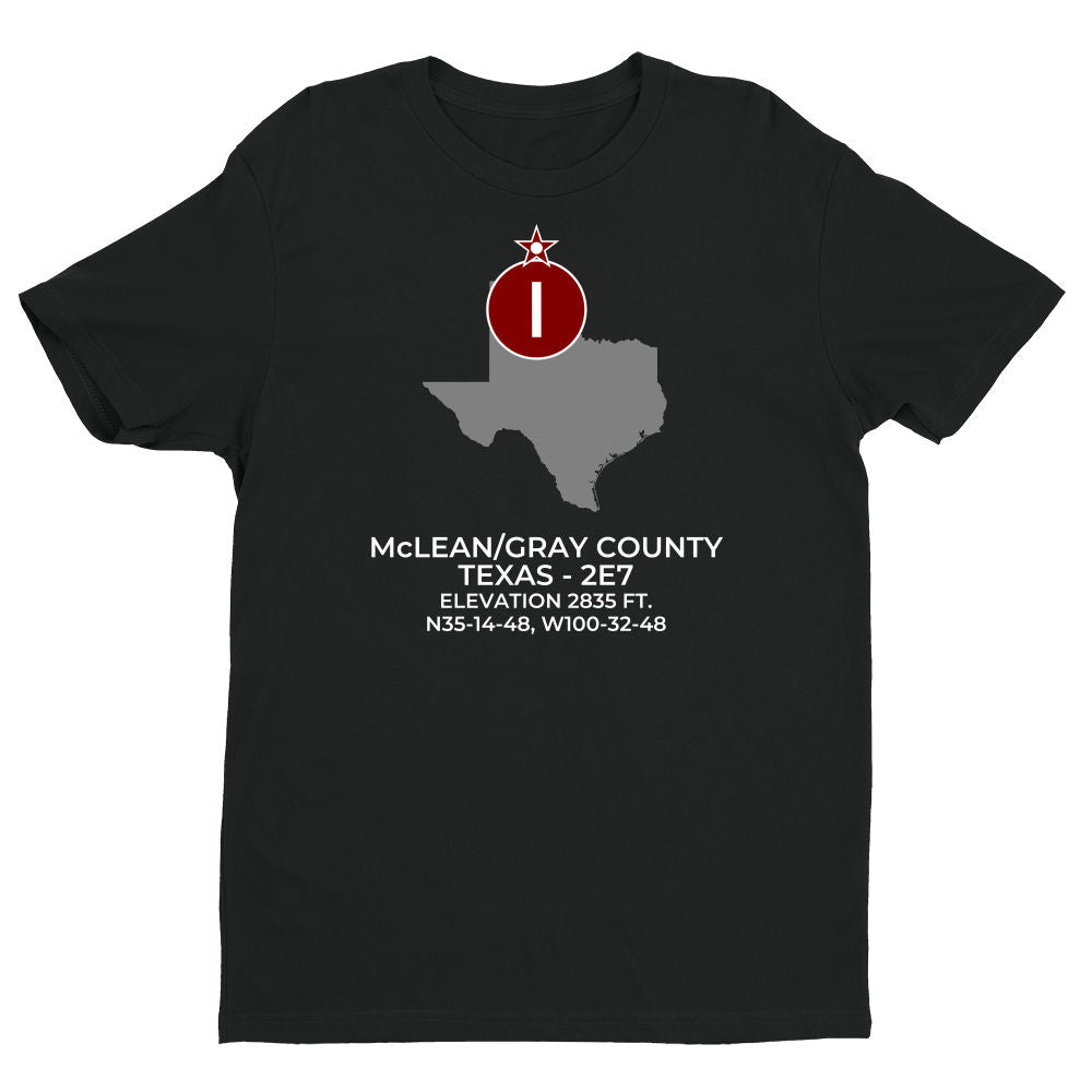 Shirts are 100% ring-spun cotton. Please inquire regarding other colors, apparel or design variations. This design features the McLEAN/GRAY COUNTY facility (2E7) in McLEAN; TEXAS (TX).