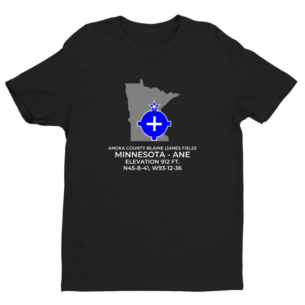 Shirts are 100% combed ring-spun cotton. Please inquire regarding other colors or design variations. This design features the ANOKA COUNTY-BLAINE (JANES FIELD) facility (ANE; KANE) in MINNEAPOLIS; MINNESOTA (MN).