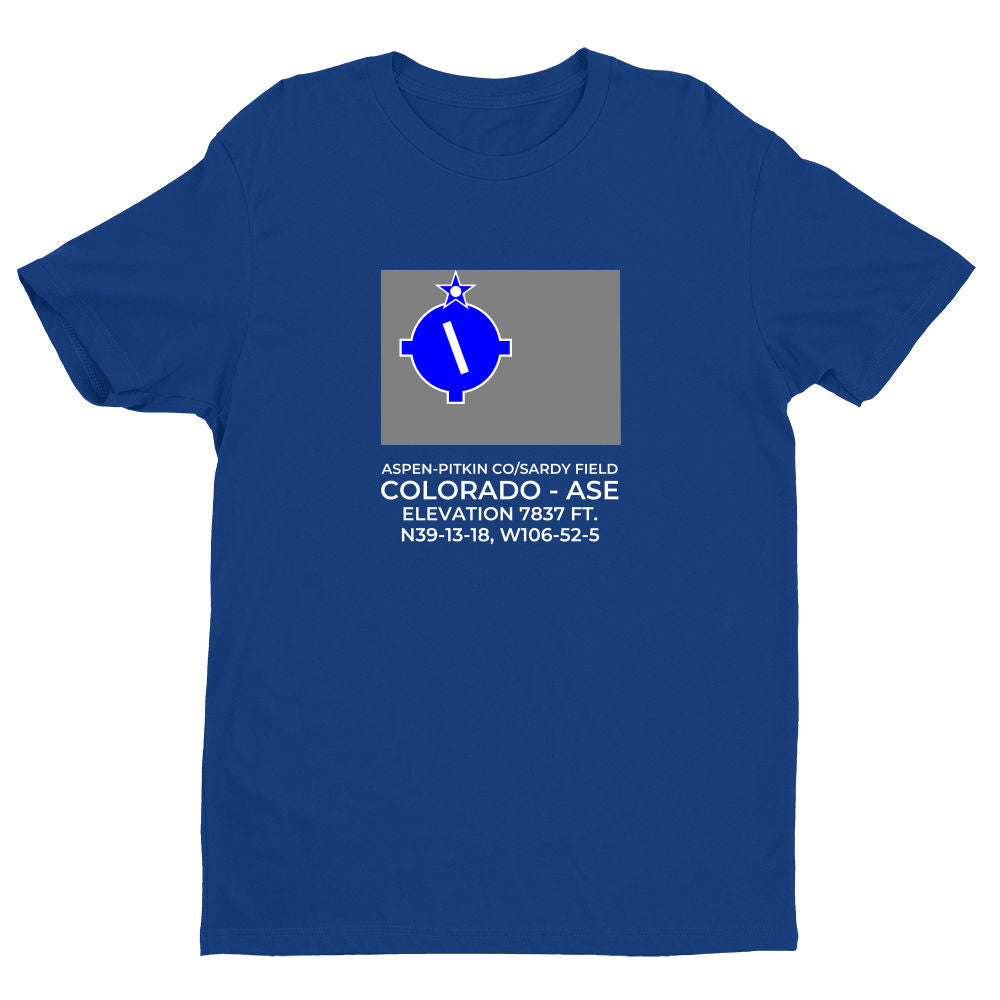 Shirts are 100% ring-spun cotton. Please inquire regarding other colors, apparel or design variations. This design features the ASPEN-PITKIN CO/SARDY FIELD facility (ASE; KASE) in ASPEN; COLORADO (CO).