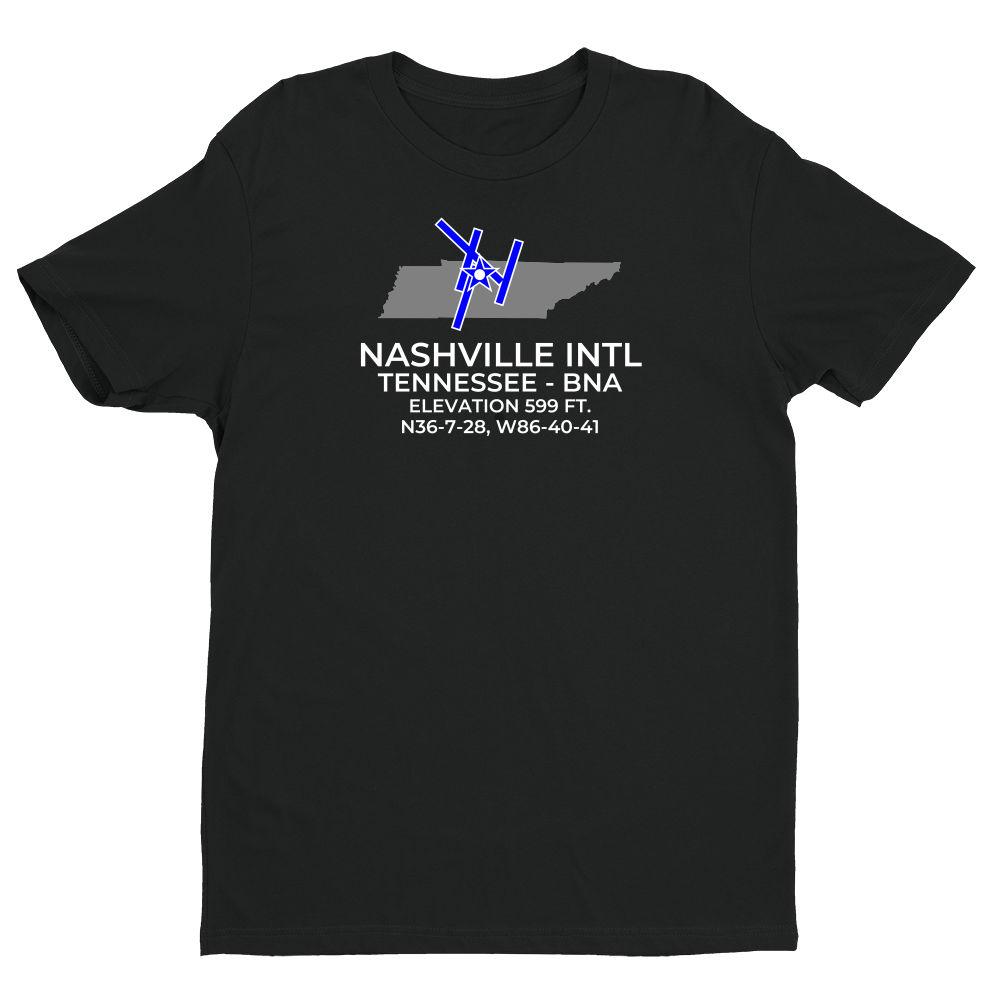 Shirts are 100% combed ring-spun cotton. Please inquire regarding other colors or design variations. This design features the NASHVILLE INTL facility (BNA; KBNA) in NASHVILLE; TENNESSEE (TN).
