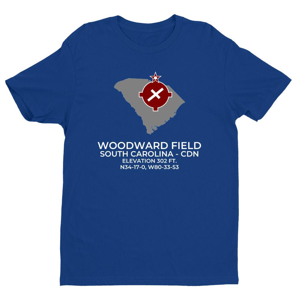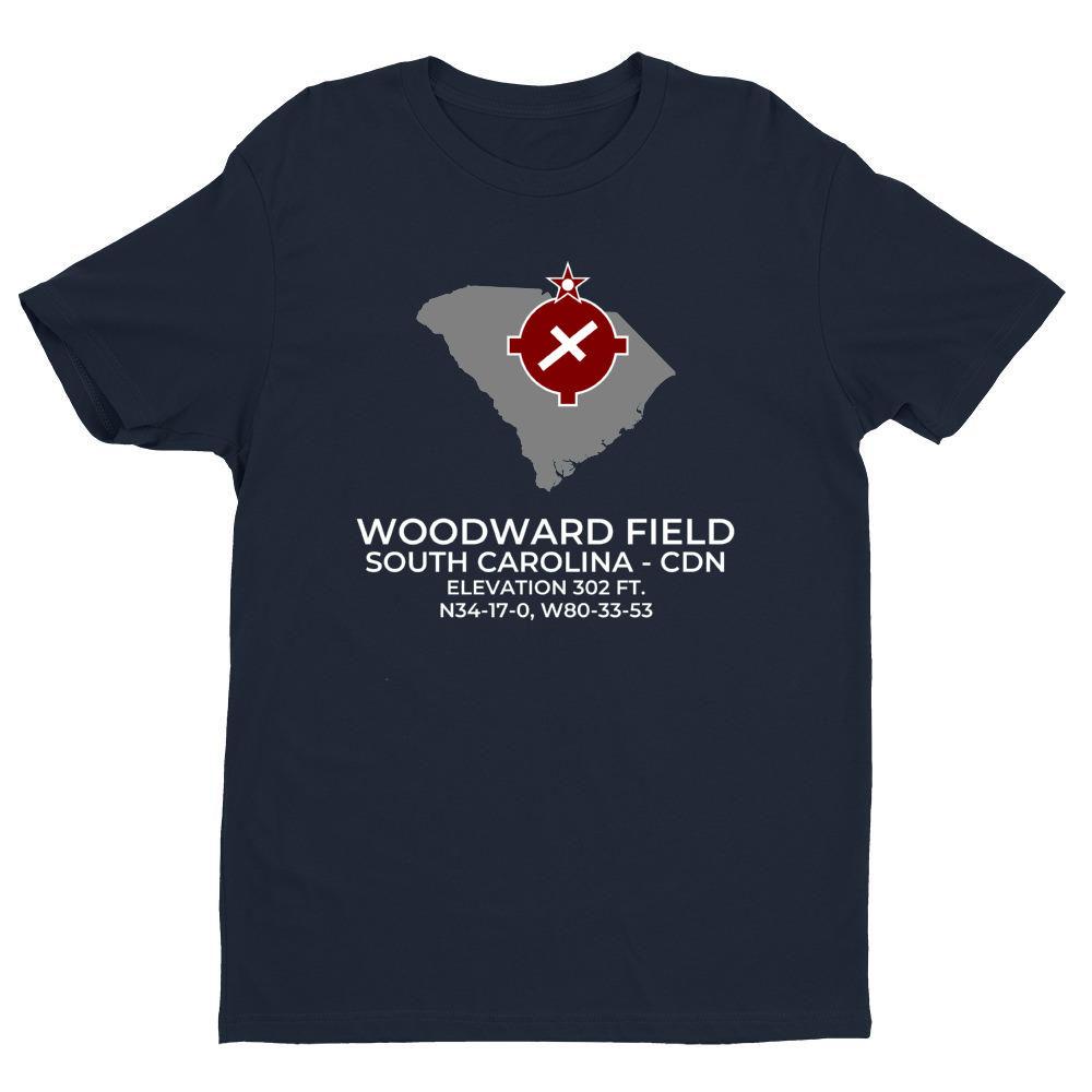 Shirts are 100% combed ring-spun cotton. Please inquire regarding other colors or design variations. This design features the WOODWARD FIELD facility (CDN; KCDN) in CAMDEN; SOUTH CAROLINA (SC).