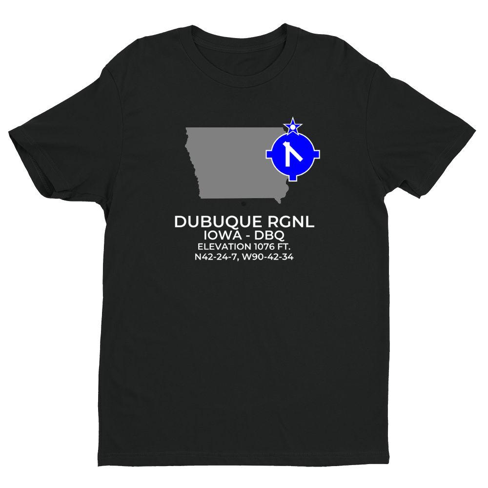 Shirts are 100% combed ring-spun cotton. Please inquire regarding other colors or design variations. This design features the DUBUQUE RGNL facility (DBQ; KDBQ) in DUBUQUE; IOWA (IA).