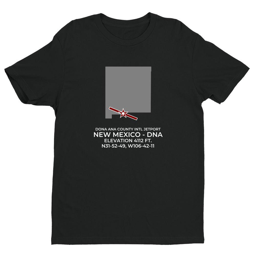 Shirts are 100% combed ring-spun cotton. Please inquire regarding other colors or design variations. This design features the DONA ANA COUNTY INTL JETPORT facility (DNA; KDNA) in SANTA TERESA; NEW MEXICO (NM).