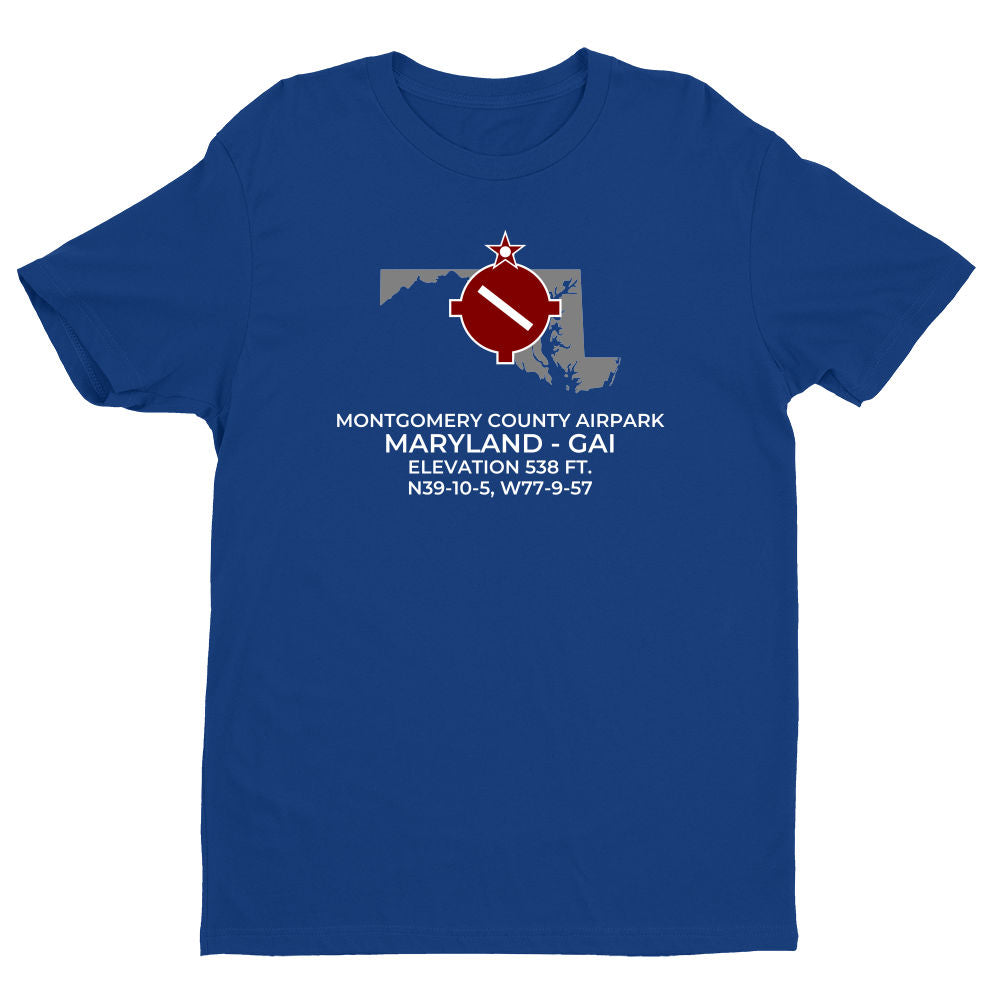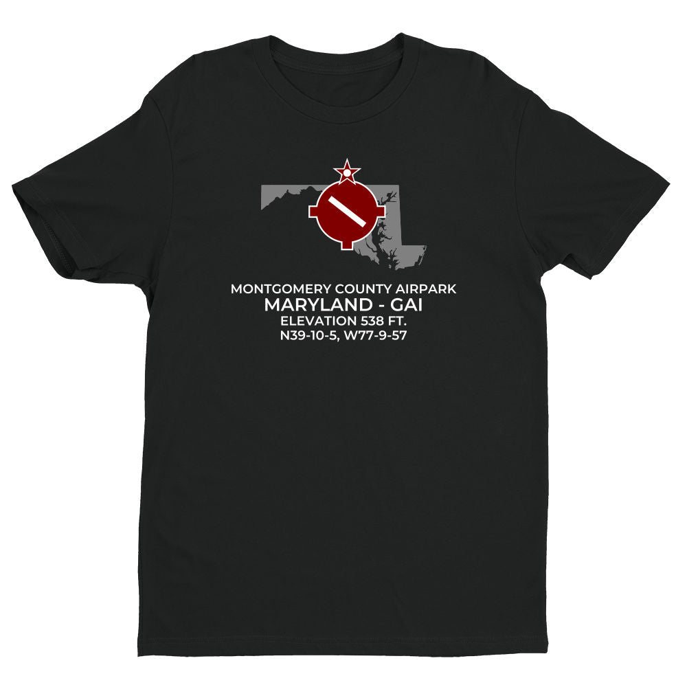Shirts are 100% ring-spun cotton. Please inquire regarding other colors, apparel or design variations. This design features the MONTGOMERY COUNTY AIRPARK facility (GAI; KGAI) in GAITHERSBURG; MARYLAND (MD).