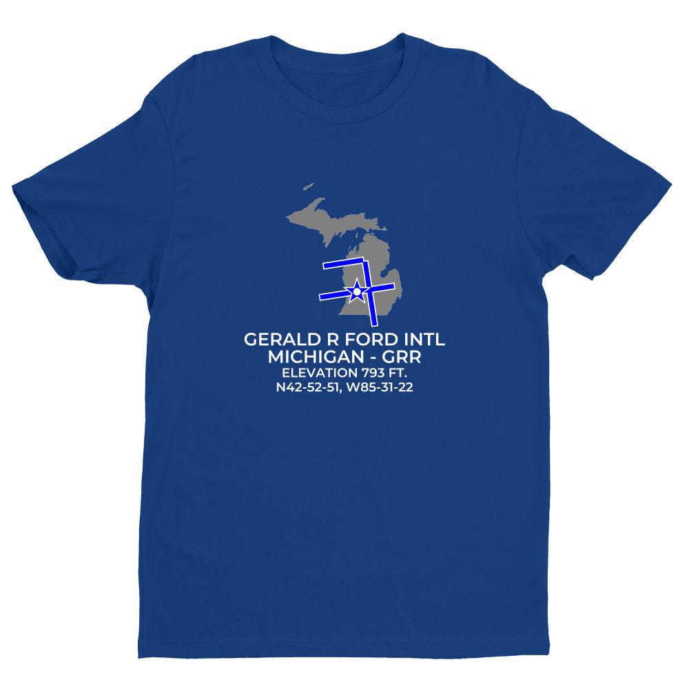 Shirts are 100% combed ring-spun cotton. Please inquire regarding other colors or design variations. This design features the GERALD R FORD INTL facility (GRR; KGRR) in GRAND RAPIDS; MICHIGAN (MI).