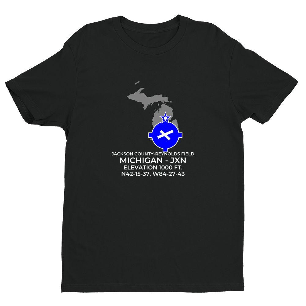 Shirts are 100% combed ring-spun cotton. Please inquire regarding other colors or design variations. This design features the JACKSON COUNTY-REYNOLDS FIELD facility (JXN; KJXN) in JACKSON; MICHIGAN (MI).