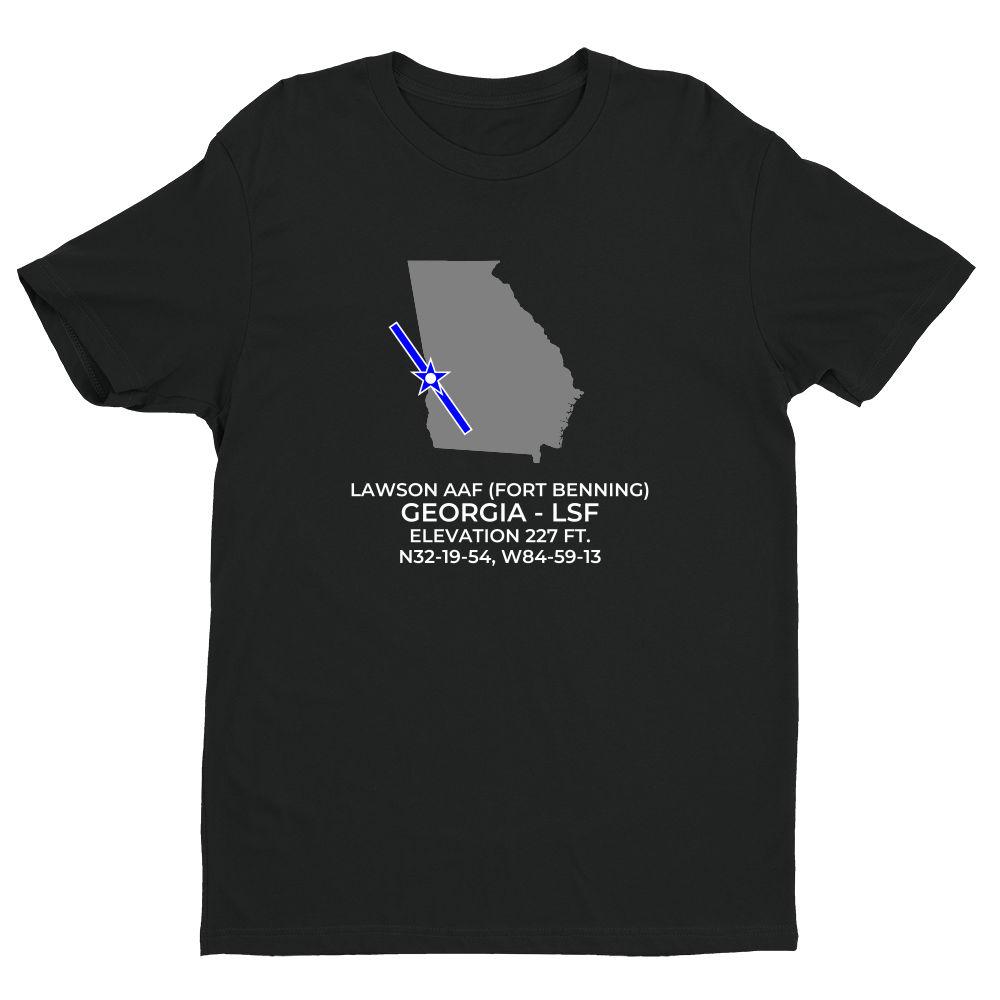 Shirts are 100% combed ring-spun cotton. Please inquire regarding other colors or design variations. This design features the LAWSON AAF (FORT BENNING) facility (LSF; KLSF) in FORT BENNING(COLUMBUS); GEORGIA (GA).