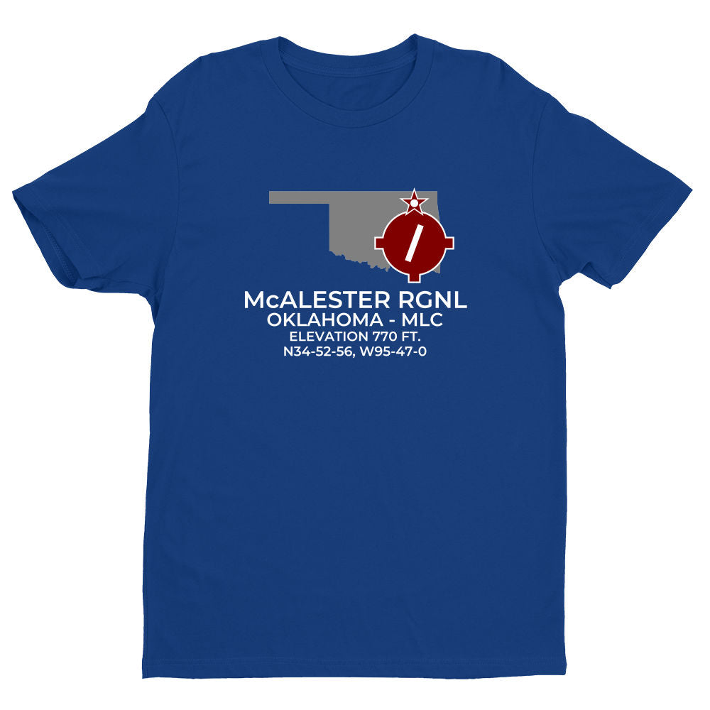 Shirts are 100% ring-spun cotton. Please inquire regarding other colors, apparel or design variations. This design features the McALESTER RGNL facility (MLC; KMLC) in McALESTER; OKLAHOMA (OK).
