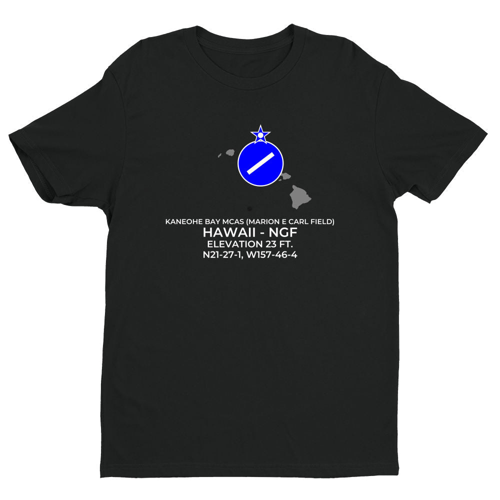 Shirts are 100% ring-spun cotton. Please inquire regarding other colors, apparel or design variations. This design features the KANEOHE BAY MCAS (MARION E CARL FIELD) facility (NGF; PHNG) in KANEOHE; HAWAII (HI).
