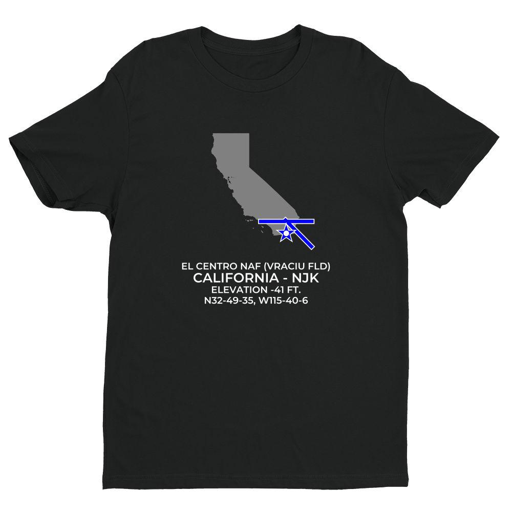 Shirts are 100% combed ring-spun cotton. Please inquire regarding other colors or design variations. This design features the EL CENTRO NAF (VRACIU FLD) facility (NJK; KNJK) in EL CENTRO; CALIFORNIA (CA).