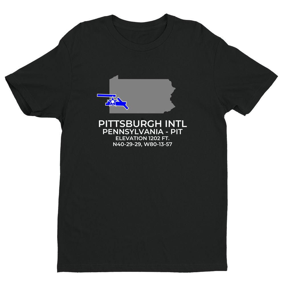Shirts are 100% combed ring-spun cotton. Please inquire regarding other colors or design variations. This design features the PITTSBURGH INTL facility (PIT; KPIT) in PITTSBURGH; PENNSYLVANIA (PA).