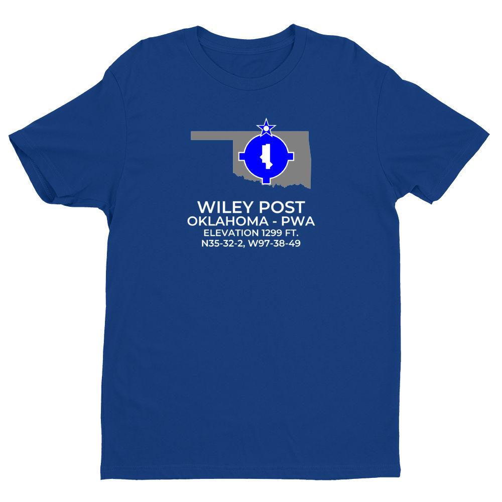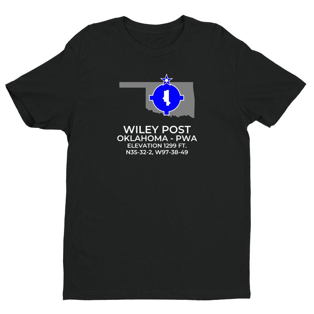 Shirts are 100% combed ring-spun cotton. Please inquire regarding other colors or design variations. This design features the WILEY POST facility (PWA; KPWA) in OKLAHOMA CITY; OKLAHOMA (OK).