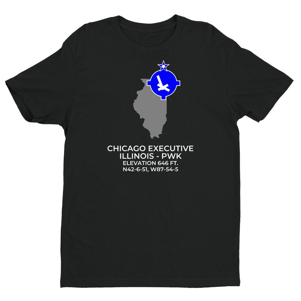 Shirts are 100% combed ring-spun cotton. Please inquire regarding other colors or design variations. This design features the CHICAGO EXECUTIVE facility (PWK; KPWK) (formerly Palwaukee Municipal Airport) in CHICAGO/PROSPECT HEIGHTS/WHEELING; ILLINOIS (IL).