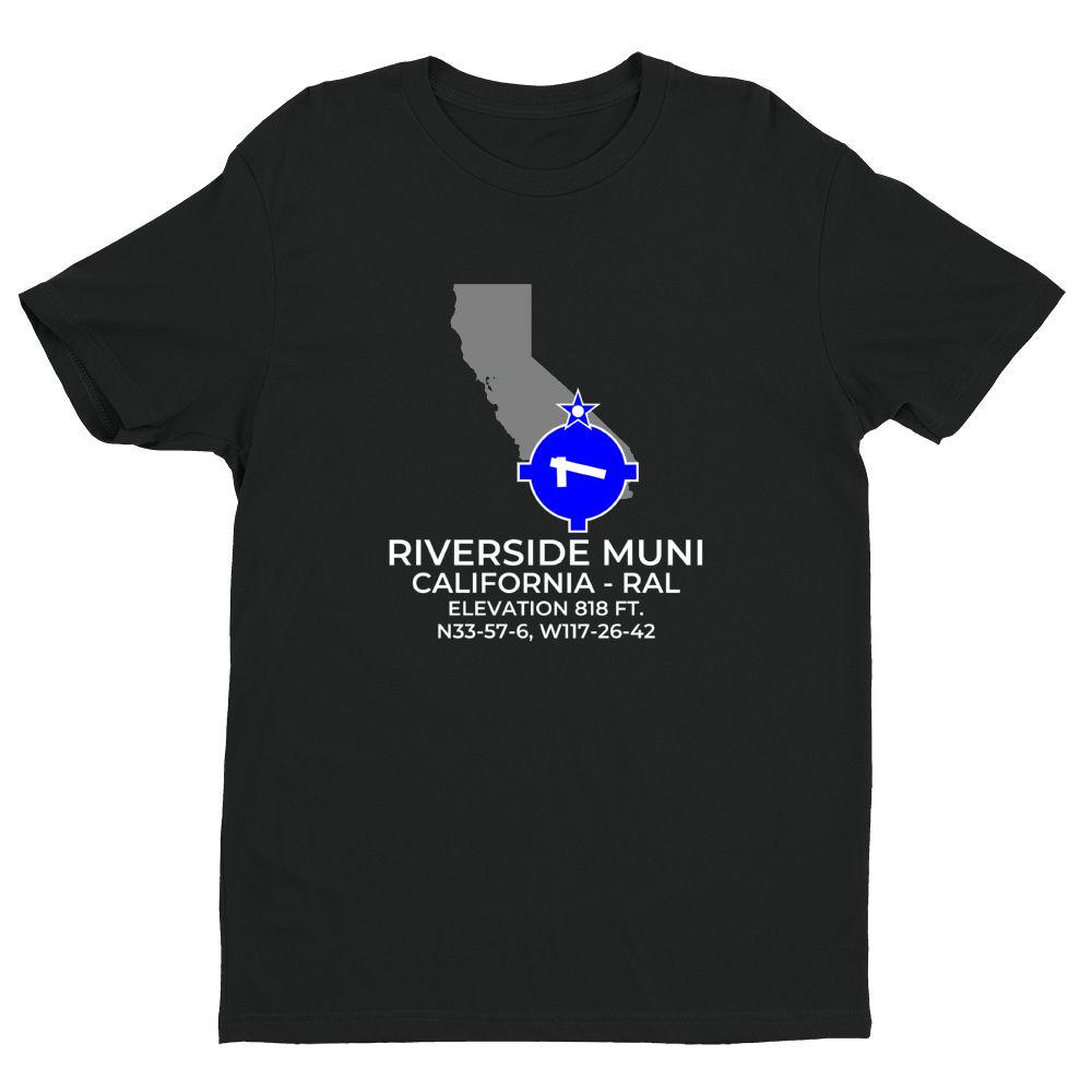 Shirts are 100% combed ring-spun cotton. Please inquire regarding other colors or design variations. This design features the RIVERSIDE MUNI facility (RAL; KRAL) in RIVERSIDE; CALIFORNIA (CA).