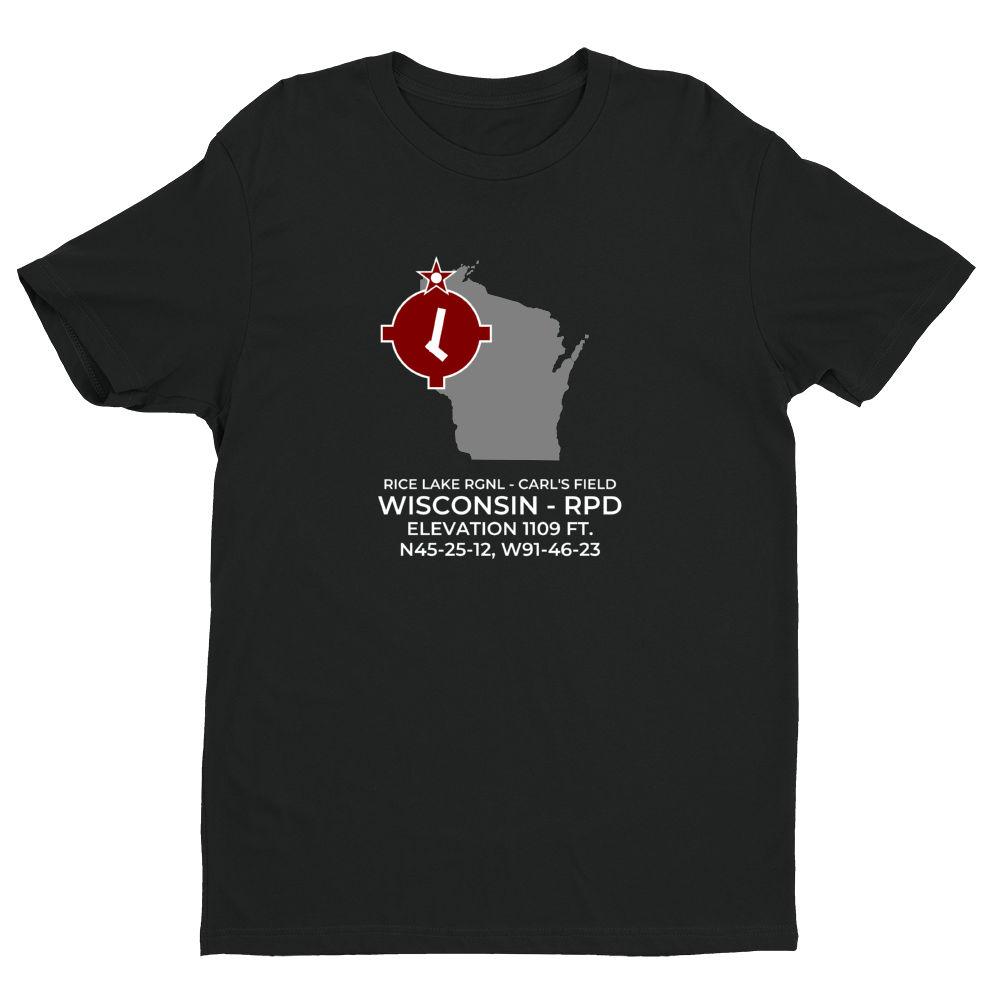 Shirts are 100% combed ring-spun cotton. Please inquire regarding other colors or design variations. This design features the RICE LAKE RGNL - CARL'S FIELD facility (RPD; KRPD) in RICE LAKE; WISCONSIN (WI).