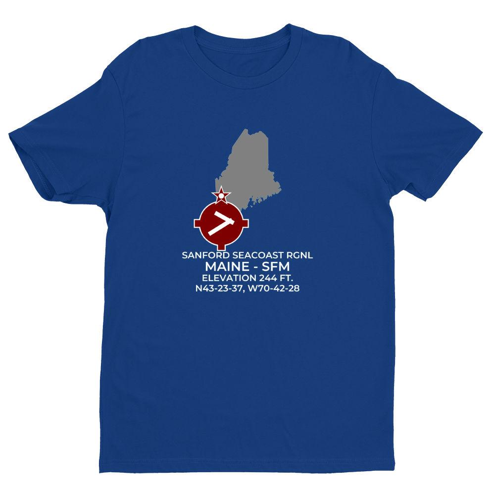 Shirts are 100% combed ring-spun cotton. Please inquire regarding other colors or design variations. This design features the SANFORD SEACOAST RGNL facility (SFM; KSFM) in SANFORD; MAINE (ME).
