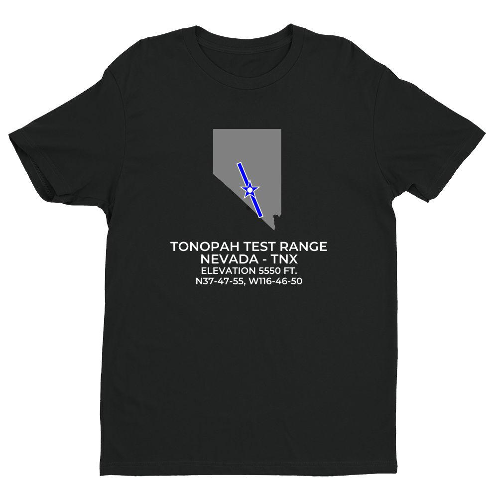 Shirts are 100% combed ring-spun cotton. Please inquire regarding other colors or design variations. This design features the TONOPAH TEST RANGE facility (TNX; KTNX) in TONOPAH; NEVADA (NV).