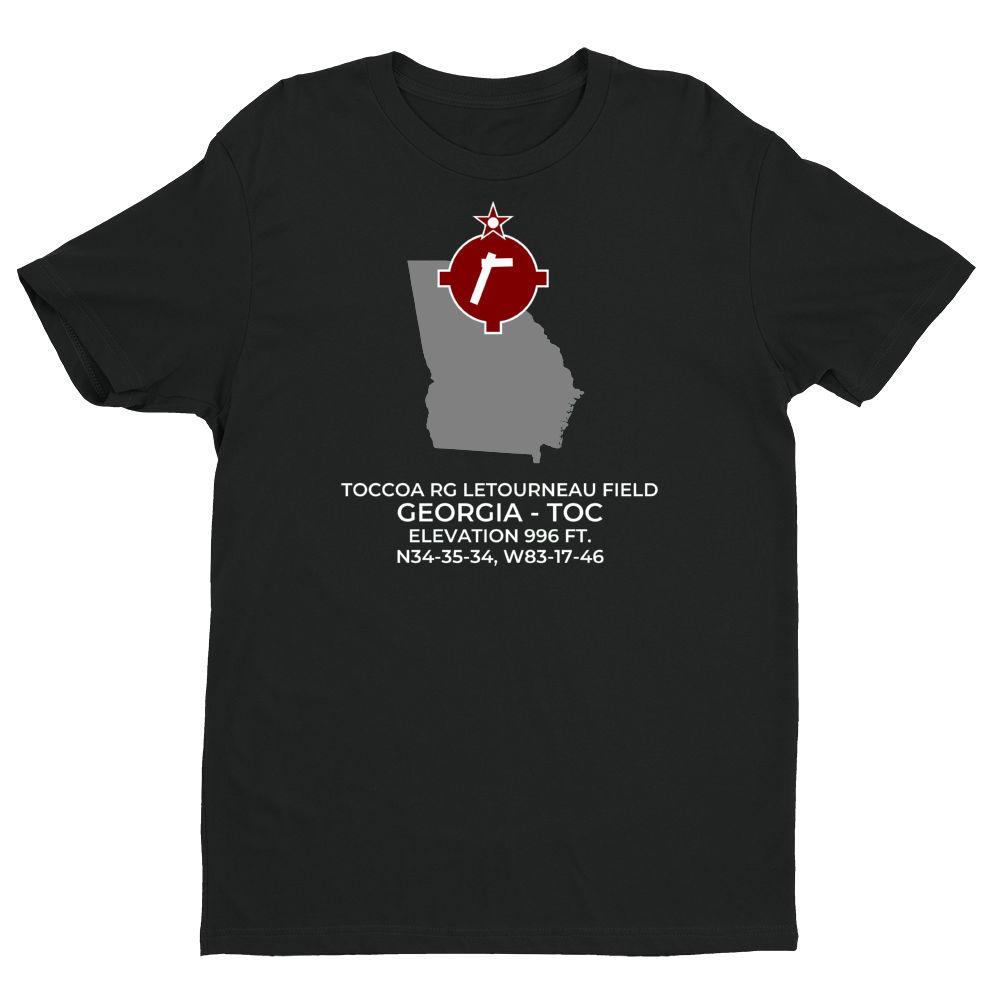 Shirts are 100% combed ring-spun cotton. Please inquire regarding other colors or design variations. This design features the TOCCOA RG LETOURNEAU FIELD facility (TOC; KTOC) in TOCCOA; GEORGIA (GA).
