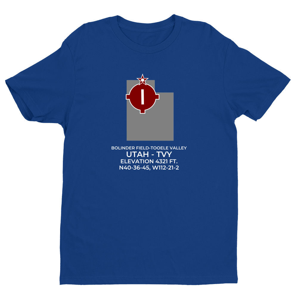 Shirts are 100% ring-spun cotton. Please inquire regarding other colors, apparel or design variations. This design features the BOLINDER FIELD-TOOELE VALLEY facility (TVY; KTVY) in TOOELE; UTAH (UT).