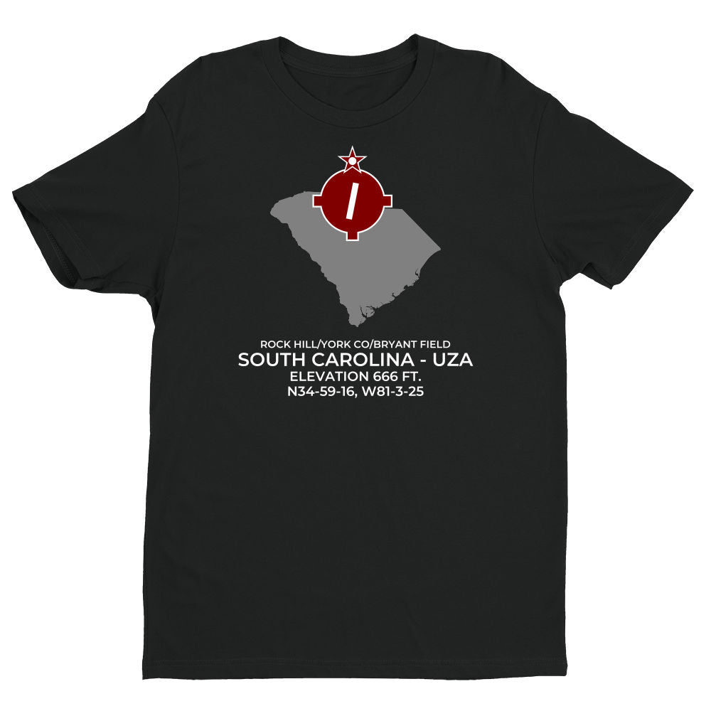 Shirts are 100% ring-spun cotton. Please inquire regarding other colors, apparel or design variations. This design features the ROCK HILL/YORK CO/BRYANT FIELD facility (UZA; KUZA) in ROCK HILL; SOUTH CAROLINA (SC).