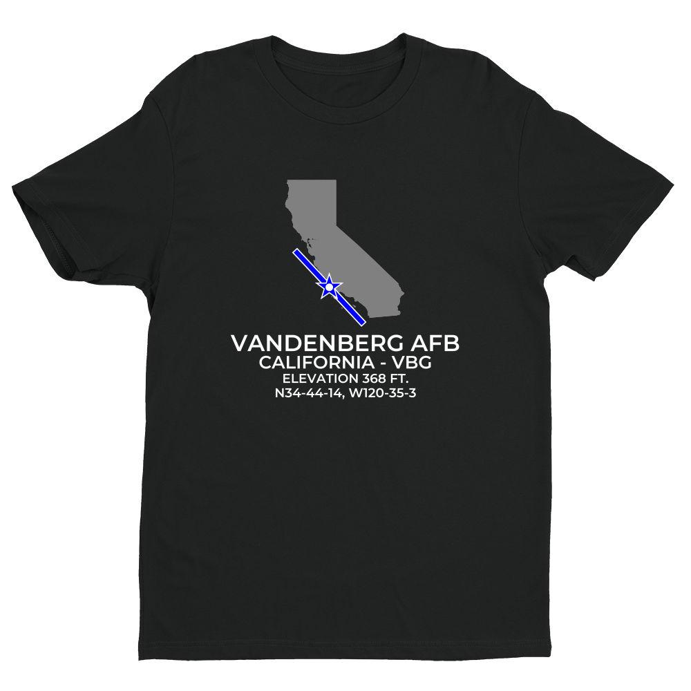 Shirts are 100% combed ring-spun cotton. Please inquire regarding other colors or design variations. This design features the VANDENBERG AFB facility (VBG; KVBG) in LOMPOC; CALIFORNIA (CA).