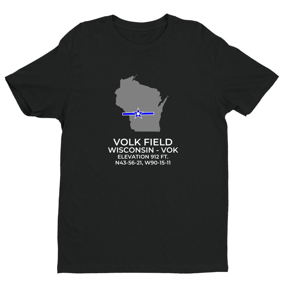 Shirts are 100% combed ring-spun cotton. Please inquire regarding other colors or design variations. This design features the VOLK FIELD facility (VOK; KVOK) in CAMP DOUGLAS; WISCONSIN (WI).