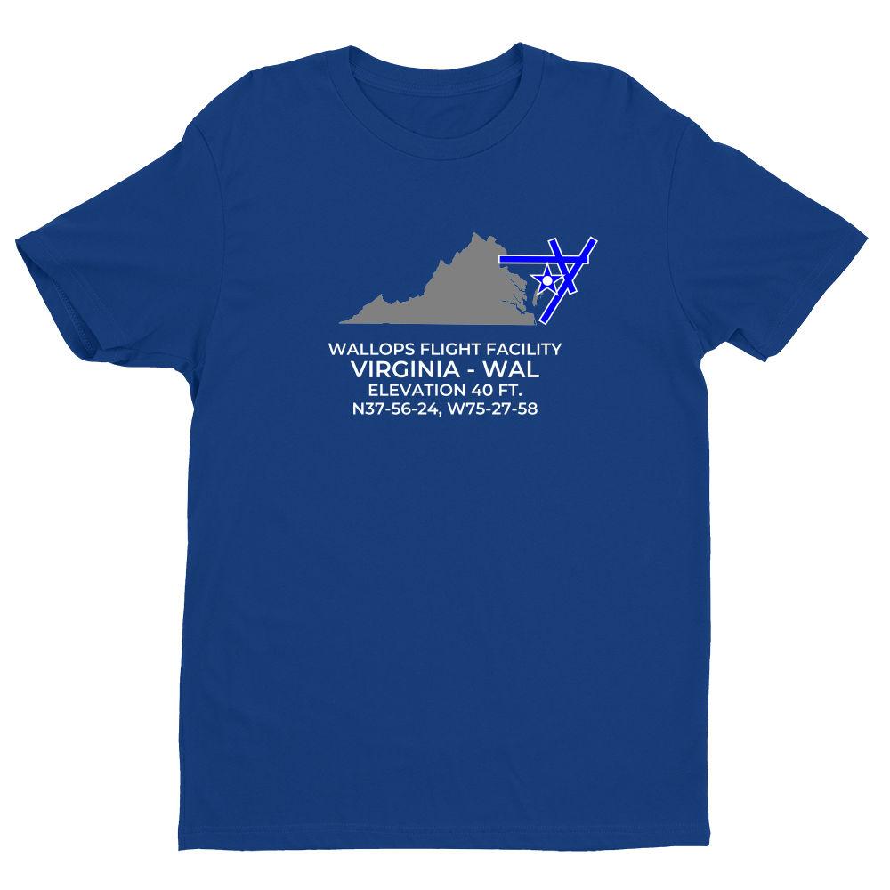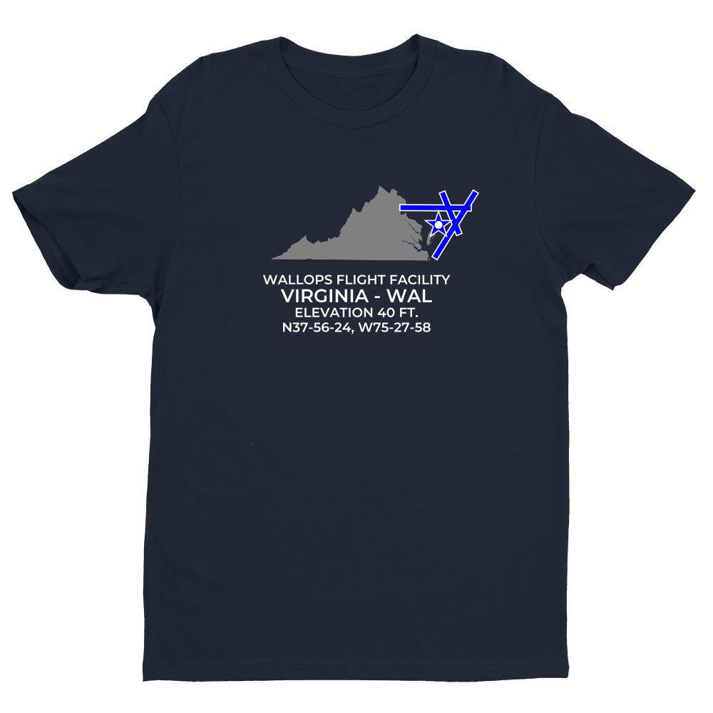 Shirts are 100% combed ring-spun cotton. Please inquire regarding other colors or design variations. This design features the WALLOPS FLIGHT FACILITY facility (WAL; KWAL) in WALLOPS ISLAND; VIRGINIA (VA).