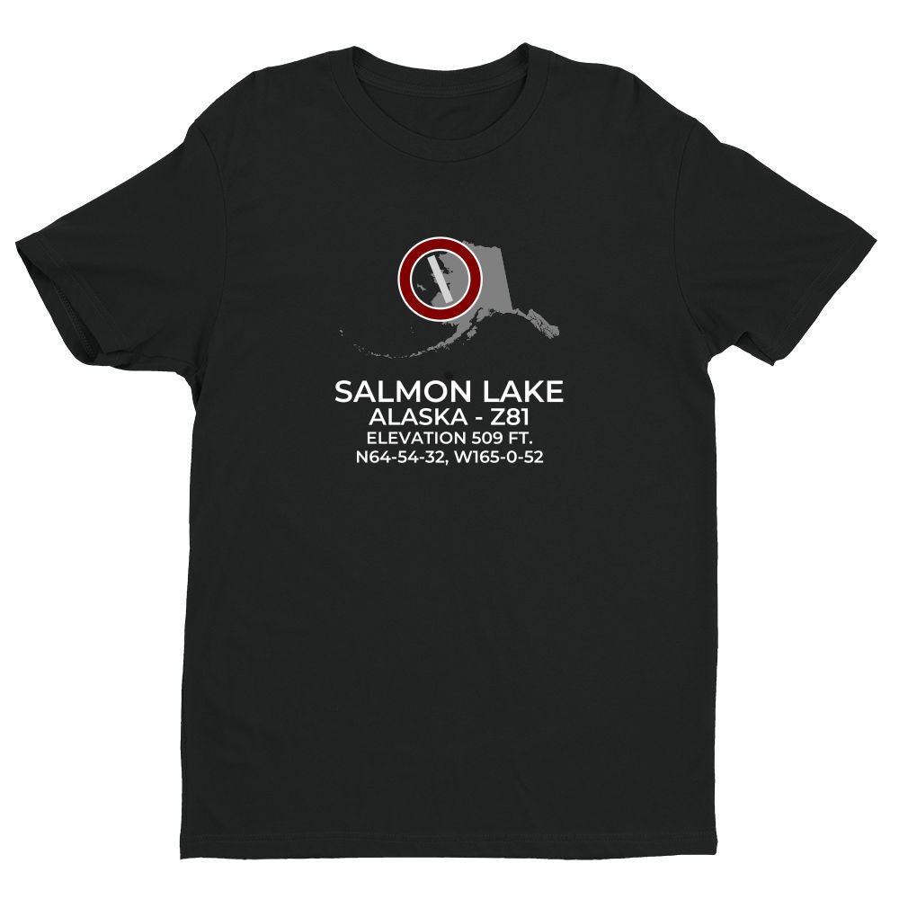 Shirts are 100% ring-spun cotton. Please inquire regarding other colors, apparel or design variations. This design features the SALMON LAKE facility (Z81) in SALMON LAKE; ALASKA (AK).
