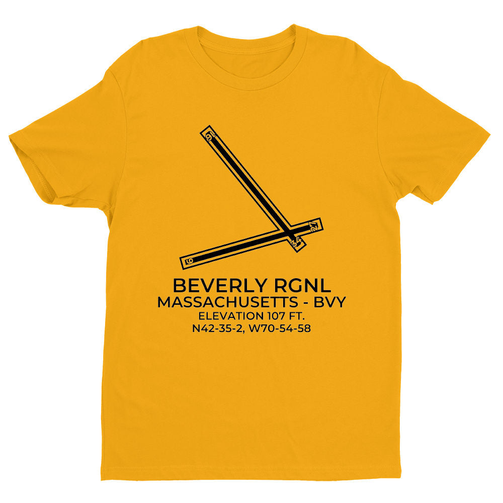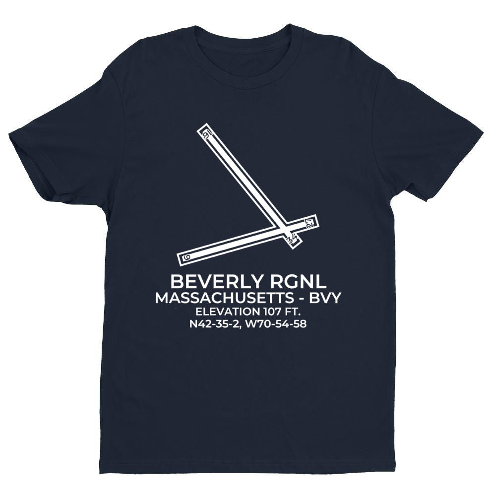 This t-shirt depicts BEVERLY; MASSACHUSETTS (BVY; KBVY).