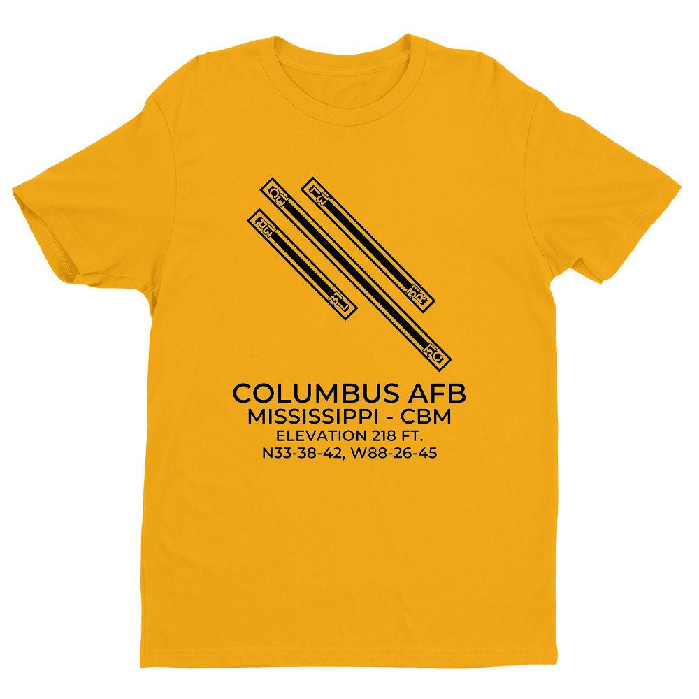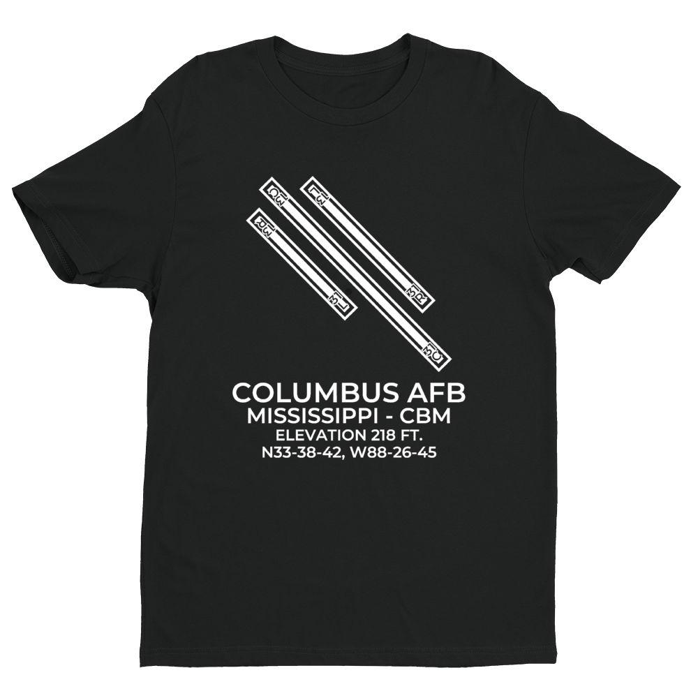This t-shirt depicts COLUMBUS AFB in COLUMBUS; MISSISSIPPI (CBM; KCBM).