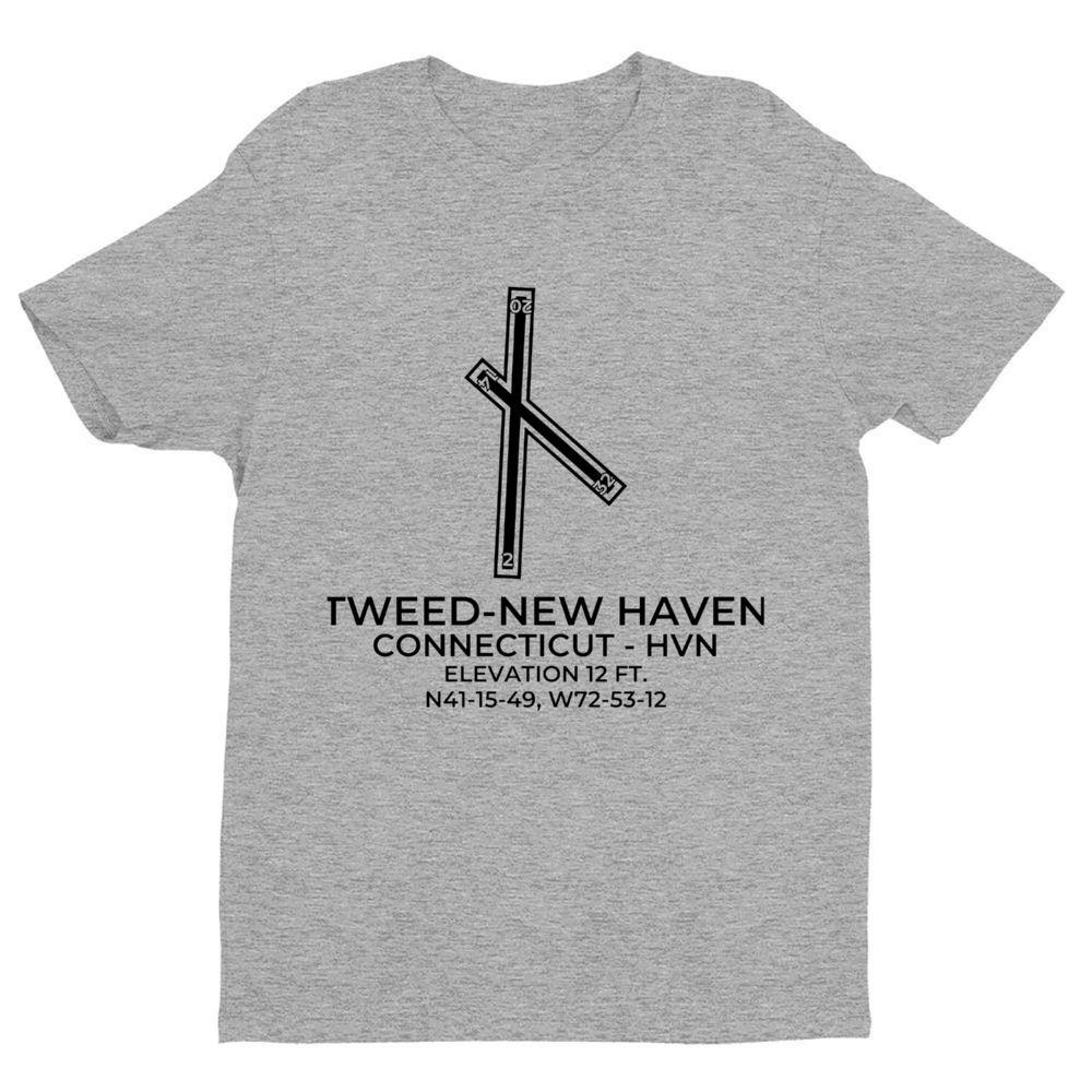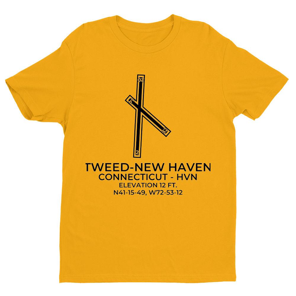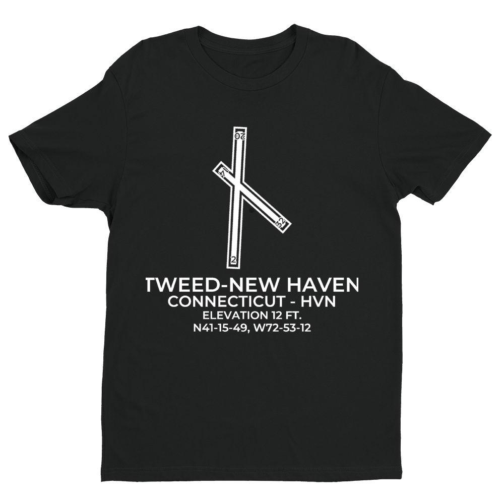 This t-shirt depicts TWEED-NEW HAVEN in NEW HAVEN; CONNECTICUT (HVN; KHVN).
