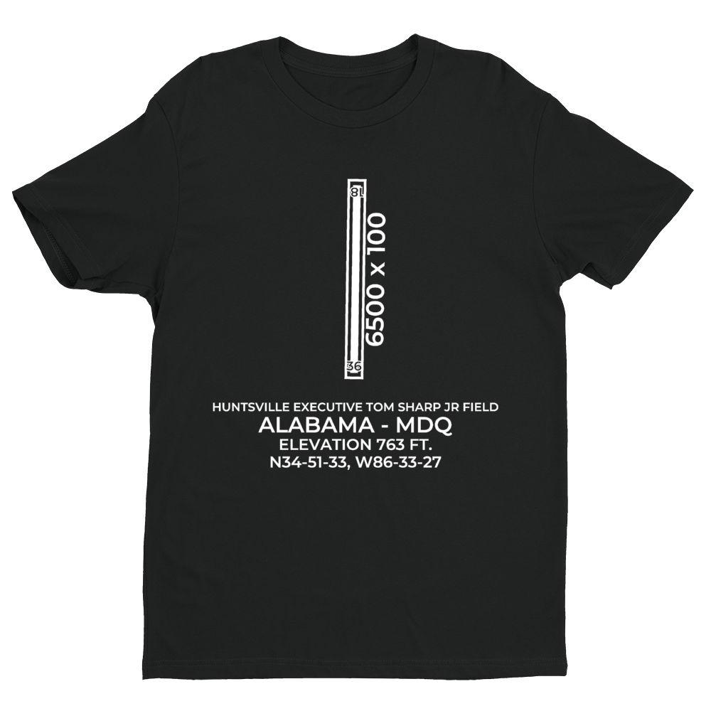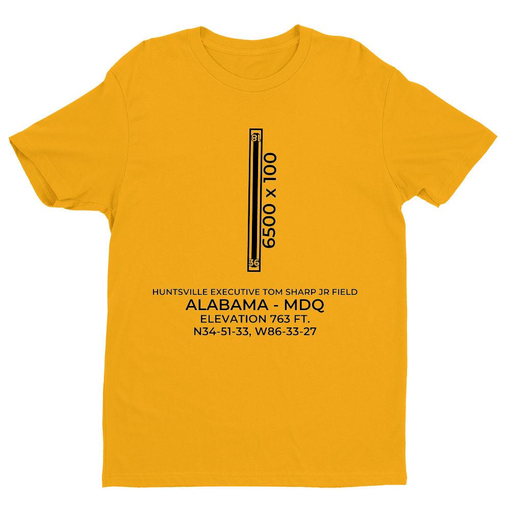 This t-shirt depicts HUNTSVILLE EXECUTIVE TOM SHARP JR FIELD in HUNTSVILLE; ALABAMA (MDQ; KMDQ).