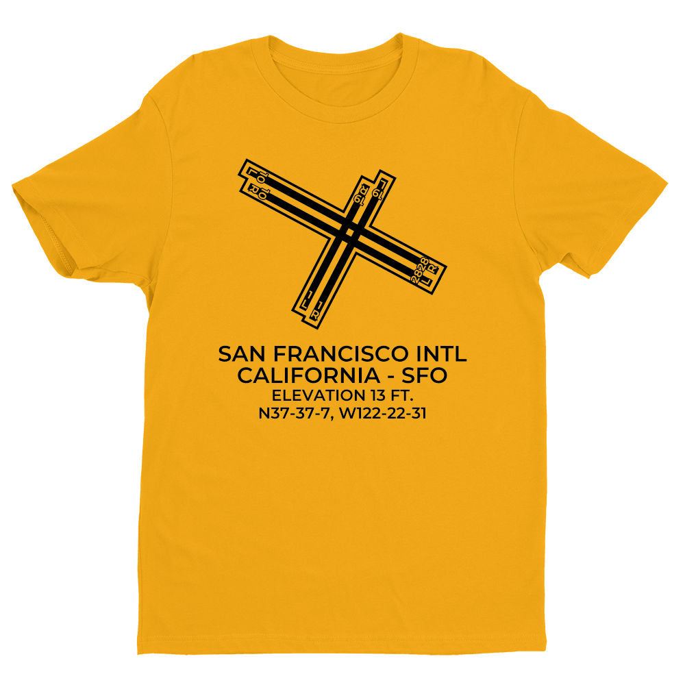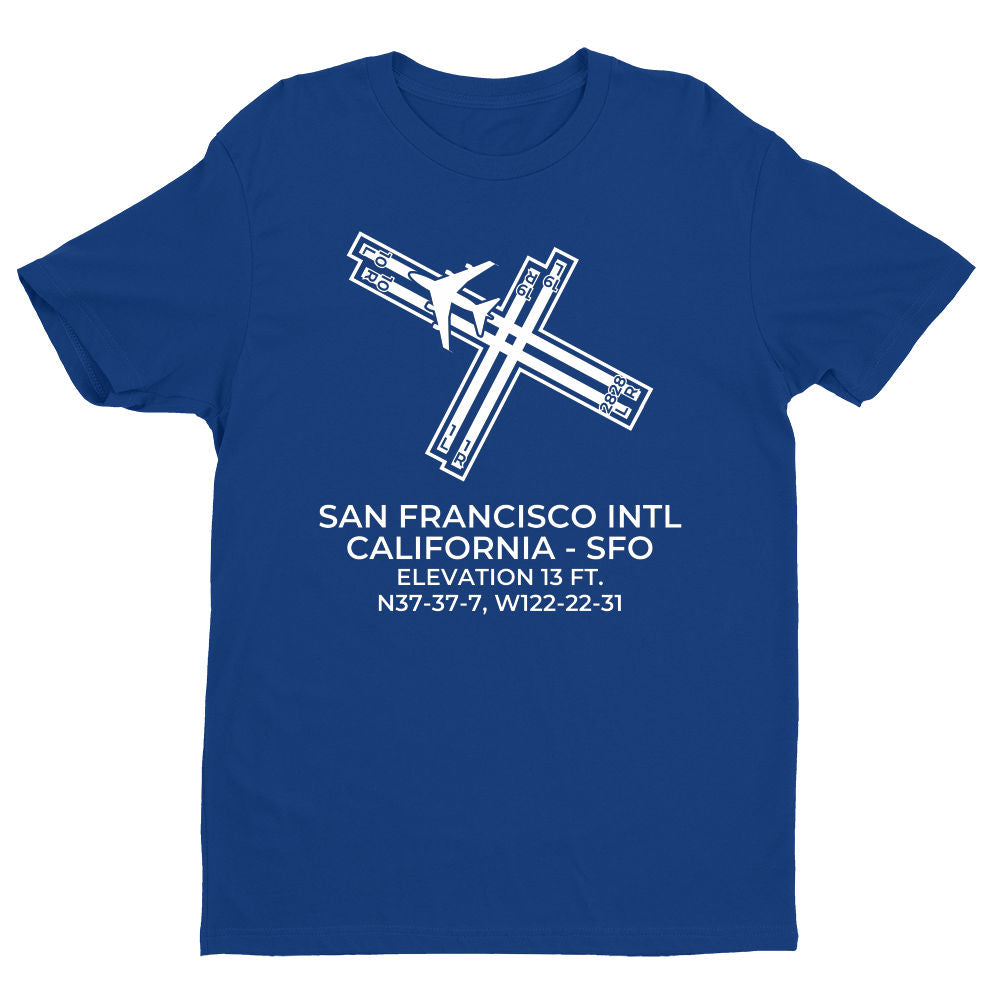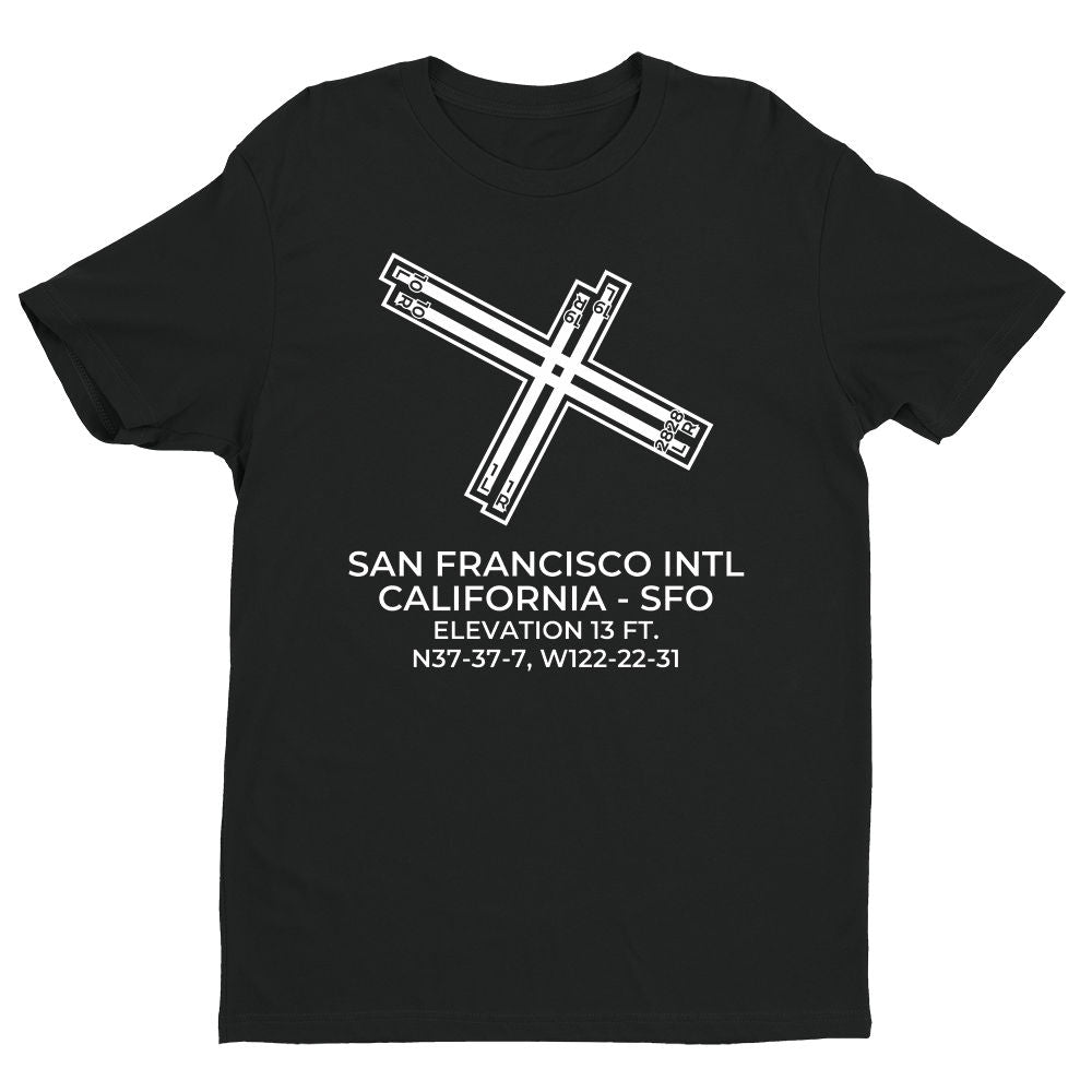 Solid colors are 100% ringspun cotton. Gray is 90% cotton - 10% polyester. Please inquire regarding design variations. This design features the SAN FRANCISCO INTL facility (SFO; KSFO) in SAN FRANCISCO; CALIFORNIA (CA).