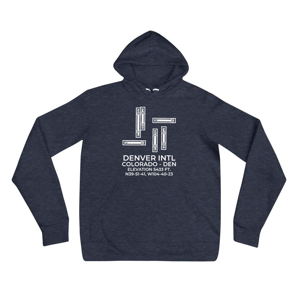 This hoodie depicts DENVER INTL outside DENVER; COLORADO (DEN; KDEN).