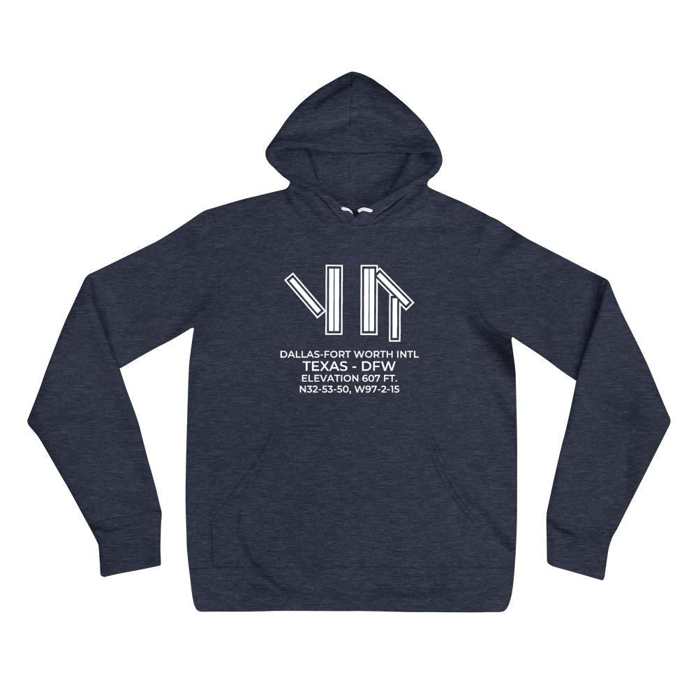 This hoodie depicts DALLAS-FORT WORTH INTL outside DALLAS-FORT WORTH; TEXAS (DFW; KDFW).