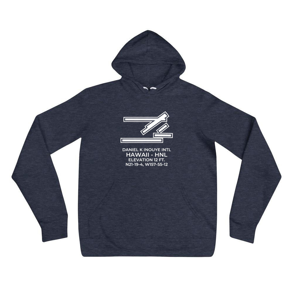 This hoodie depicts DANIEL K INOUYE INTL near HONOLULU; HAWAII (HNL; PHNL).