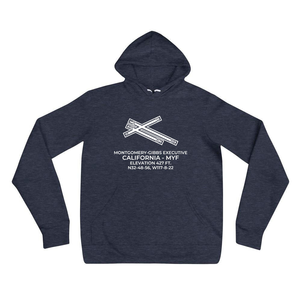 This hoodie depicts MONTGOMERY-GIBBS EXECUTIVE near SAN DIEGO; CALIFORNIA (MYF; KMYF).