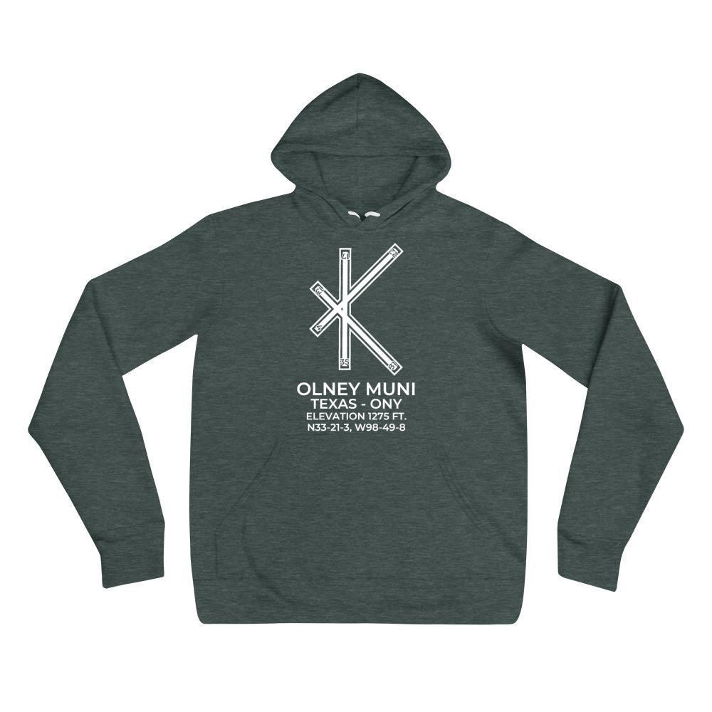 This hoodie depicts OLNEY MUNI near OLNEY; TEXAS (ONY; KONY).