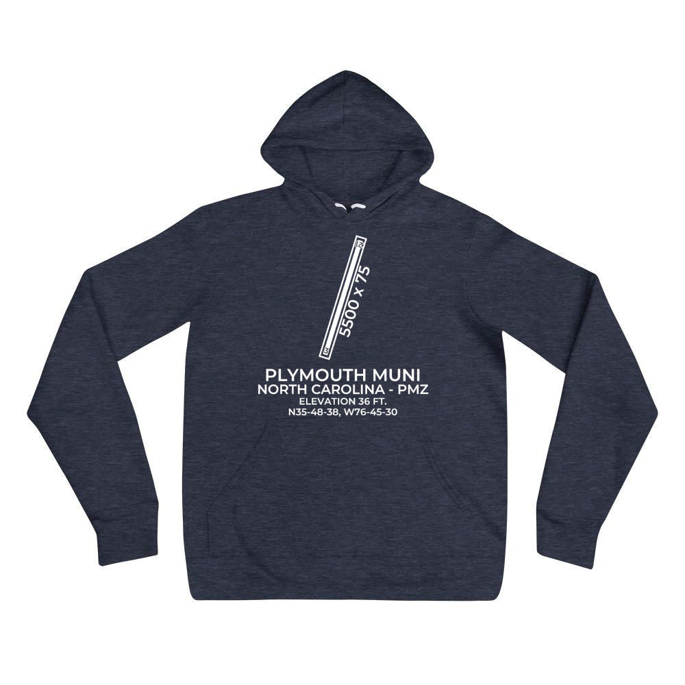 This hoodie depicts PLYMOUTH MUNI in PLYMOUTH; NORTH CAROLINA (PMZ; KPMZ).