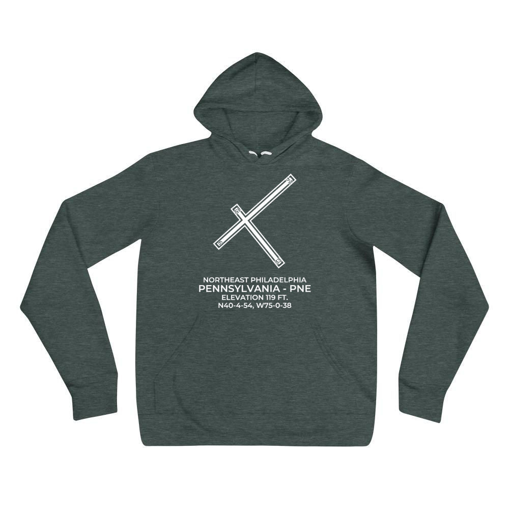 This hoodie depicts NORTHEAST PHILADELPHIA outside PHILADELPHIA; PENNSYLVANIA (PNE; KPNE).