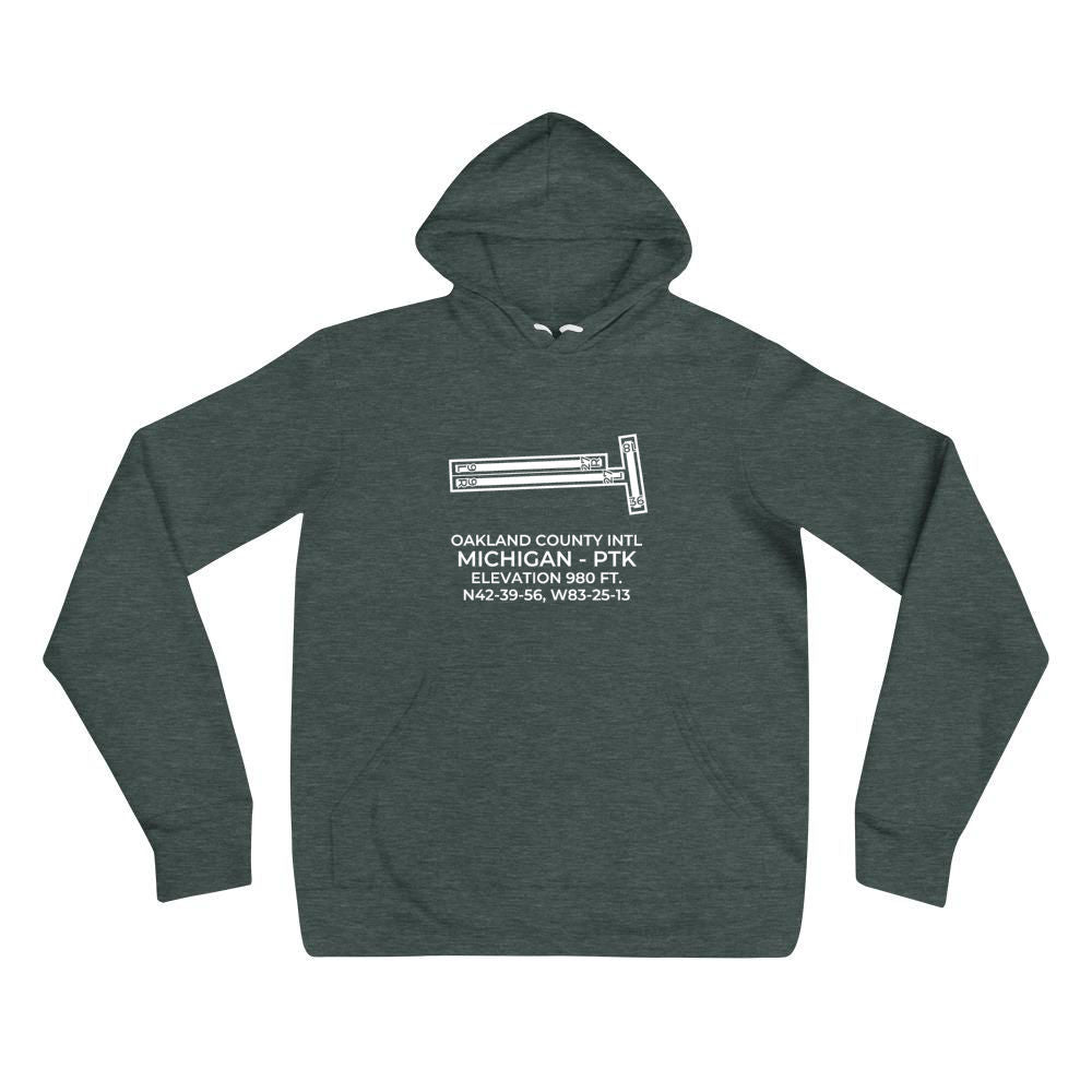 This hoodie depicts OAKLAND COUNTY INTL near PONTIAC; MICHIGAN (PTK; KPTK).