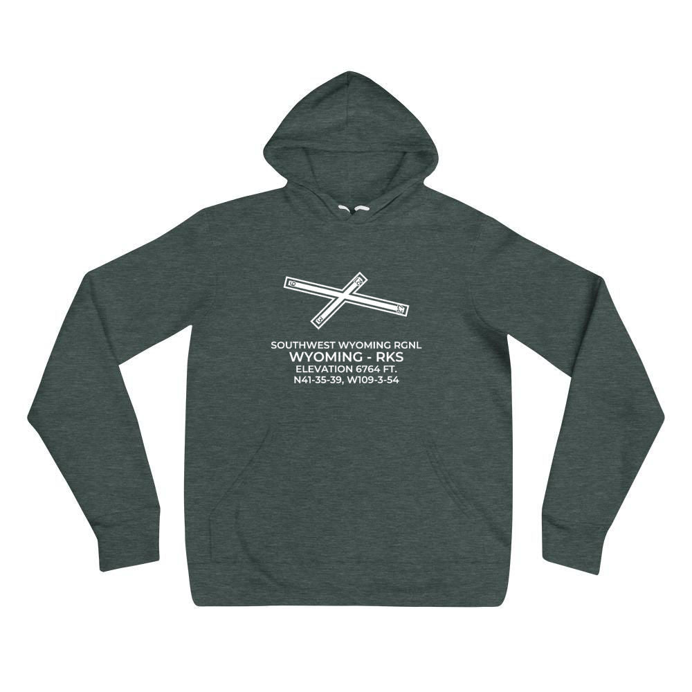 This hoodie depicts SOUTHWEST WYOMING RGNL near ROCK SPRINGS; WYOMING (RKS; KRKS).