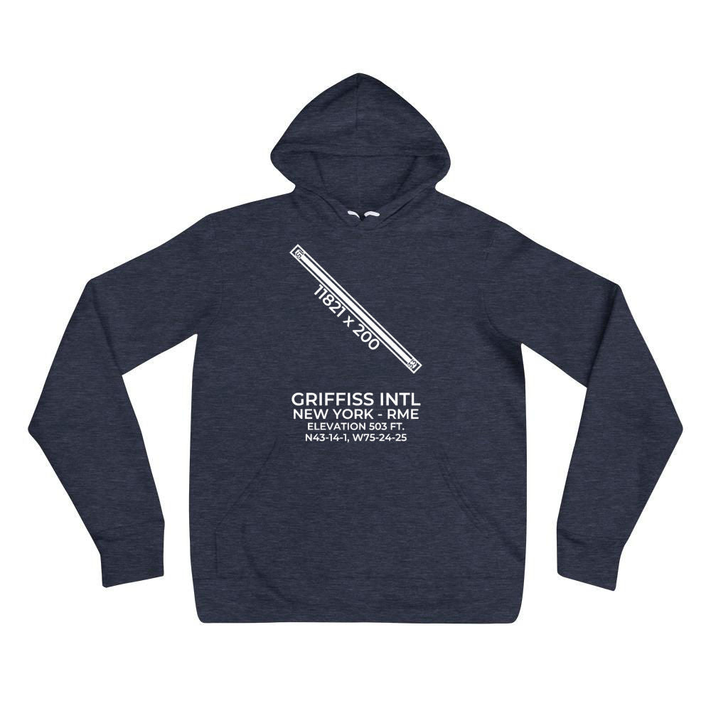 This hoodie depicts GRIFFISS INTL in ROME; NEW YORK (RME; KRME).