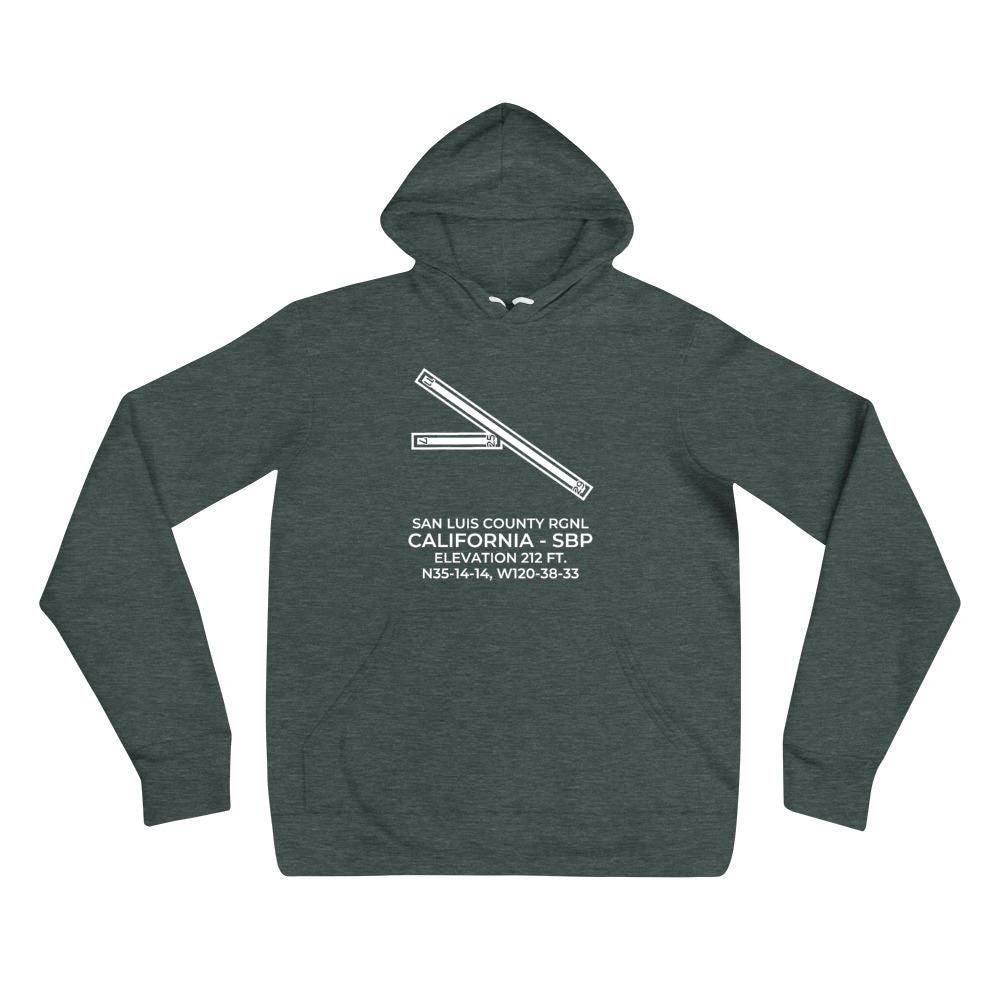 This hoodie depicts SAN LUIS COUNTY RGNL near SAN LUIS OBISPO; CALIFORNIA (SBP; KSBP).