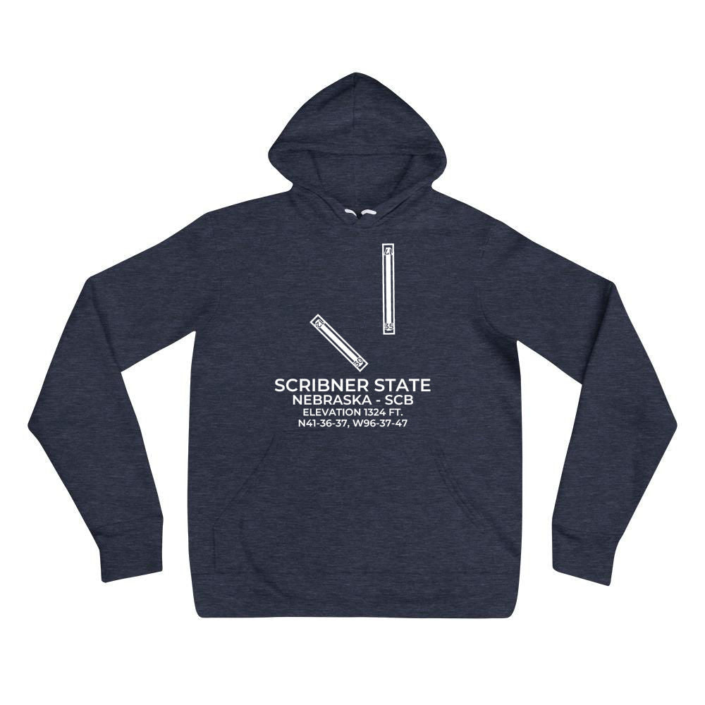 This hoodie depicts SCRIBNER STATE near SCRIBNER; NEBRASKA (SCB; KSCB).