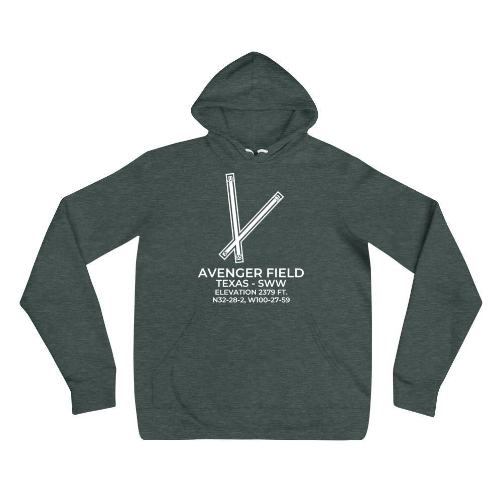 This hoodie depicts AVENGER FIELD near SWEETWATER; TEXAS (SWW; KSWW).