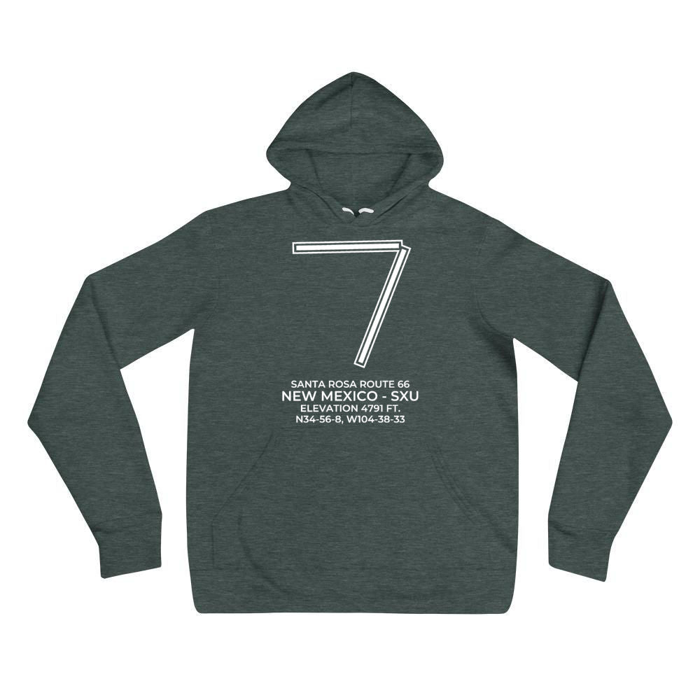 This hoodie depicts SANTA ROSA ROUTE 66 near SANTA ROSA; NEW MEXICO (SXU; KSXU).