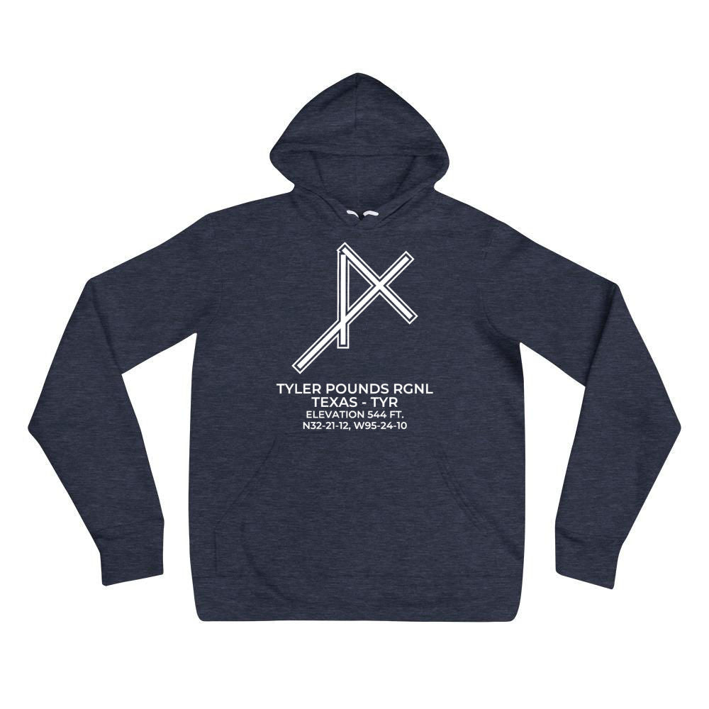 This hoodie depicts TYLER POUNDS RGNL near TYLER; TEXAS (TYR; KTYR).