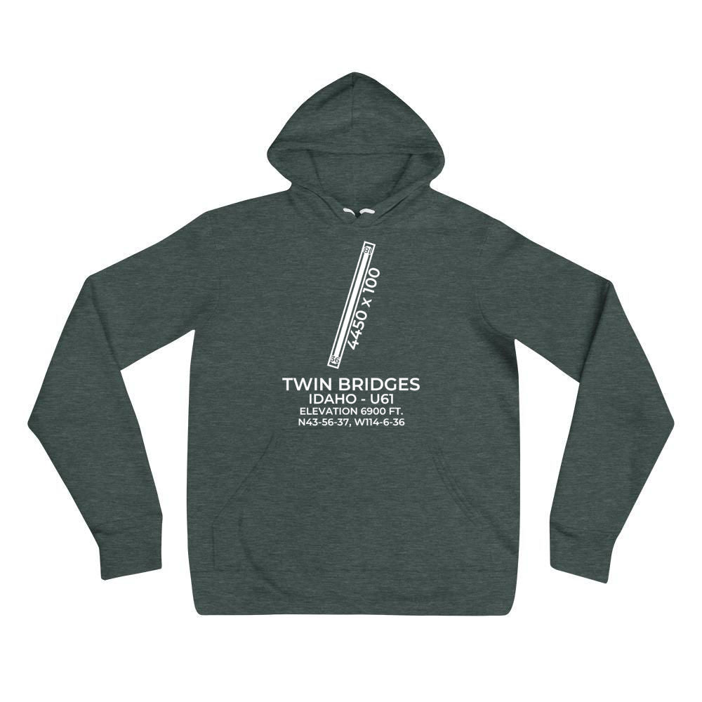 This hoodie depicts TWIN BRIDGES outside KETCHUM; IDAHO (U61).
