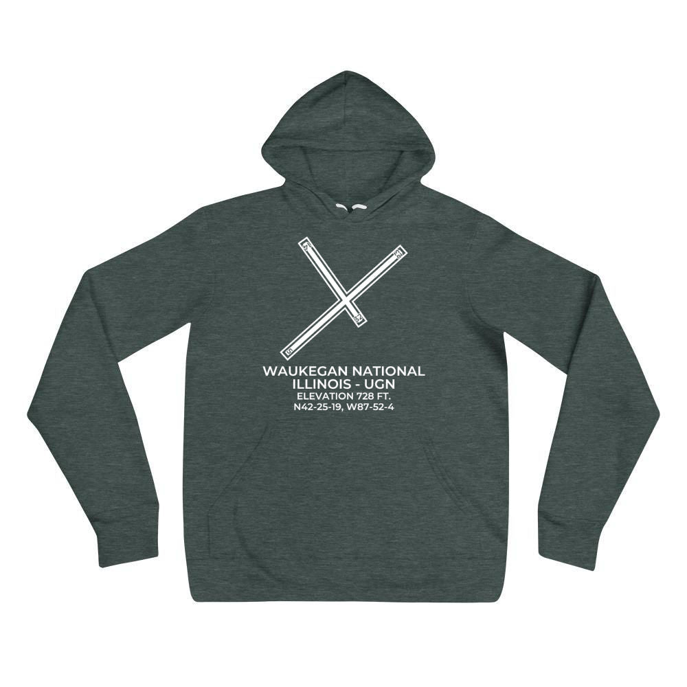 This hoodie depicts WAUKEGAN NATIONAL outside CHICAGO/WAUKEGAN; ILLINOIS (UGN; KUGN).